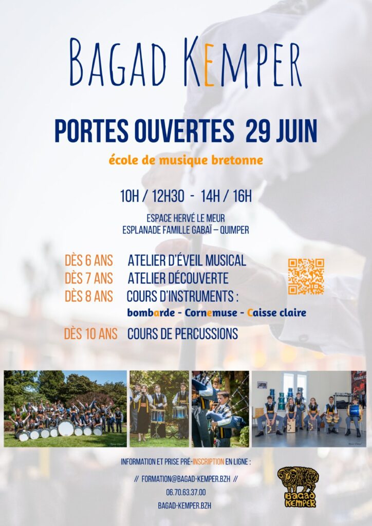 L’association Bagad Kemper organise, une journée portes ouvertes de l’école de musique, le samedi 29 Juin, de 10h à 12h30, puis 14h à 16h, dans nos locaux Esplanade Famille Gabaï à Quimper.